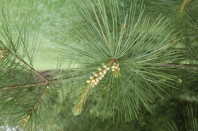 Evergreen conifers are primarily wind-pollinated and do not produce nectar-rich flowers. Male cones produce clouds of yellow pollen which wind transfers to female cones. Bees do collect sap and resin used to make propolis for securing and sterilizing the hive. Pine trees serve the ecosystem as hosts for over 200 species of caterpillars. Conifers provide year-round shelter and good nest building sites for birds.